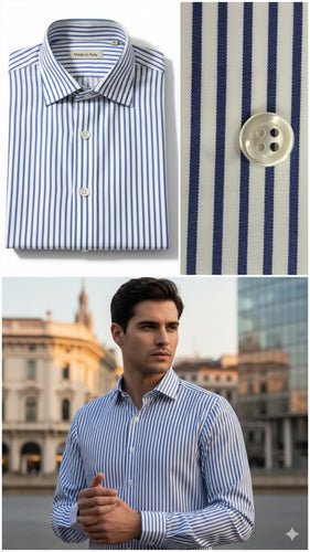 Camicia Uomo Fasciata blu rigato bianco su fondo blu twill titolo 120 alta qualità elegante puro cotone colletto mezzo francese oxford Made in Italy