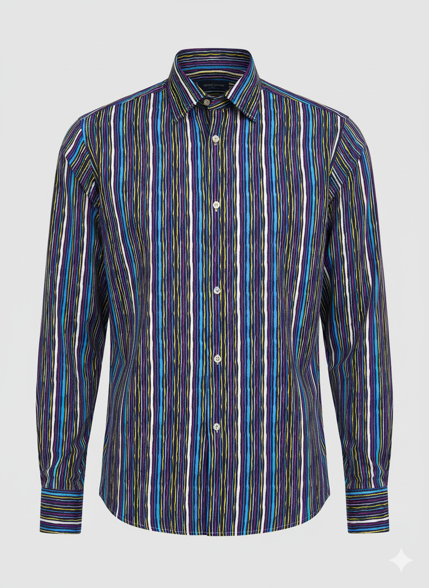 Camicia Fantasia blu Rigata stampa multicolor Made in Italy. Design italiano unico e stile di alta qualità, realizzati con tessuti pregiati e stampa multicolore vivace. Comodità e artigianalità Made in Italy per un look elegante e raffinato.