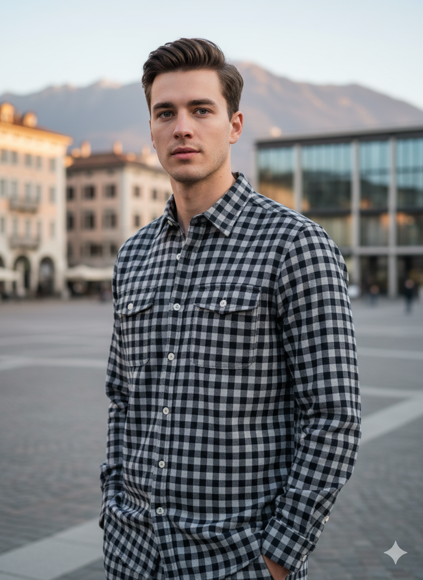 Camicia a quadri grigio nero doppie tasche e pattine puro cotone Made in Italy